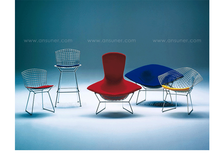 bertoia stool(伯托埃凳)是美国设计师伯托埃设计的,1950年,Harry Bertoia尝试用钢枝制造出结实、轻便而又经济的椅子。1952年,他通过弯曲的金属棒来设计出这张极具创意的伯托埃吧椅(Harry Bertoia Barstool),这张椅子适用与餐厅、酒吧、高档会所等地,利用了金的外形给椅子赋予了现代感,因为生产简单、材料简便,时候大规模的生产,非常适用于商业空间,这或许就是设计的力量可以改变 经济结构吧。