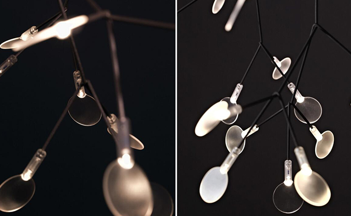 The decorative LED lamp inspired by the Heracleum Plant now comes in two sizes. Theleaves ramify from a branch creating a very technixal,natural structure,By using the technique of coating conductive layers.Adesign not possible with normal wires.