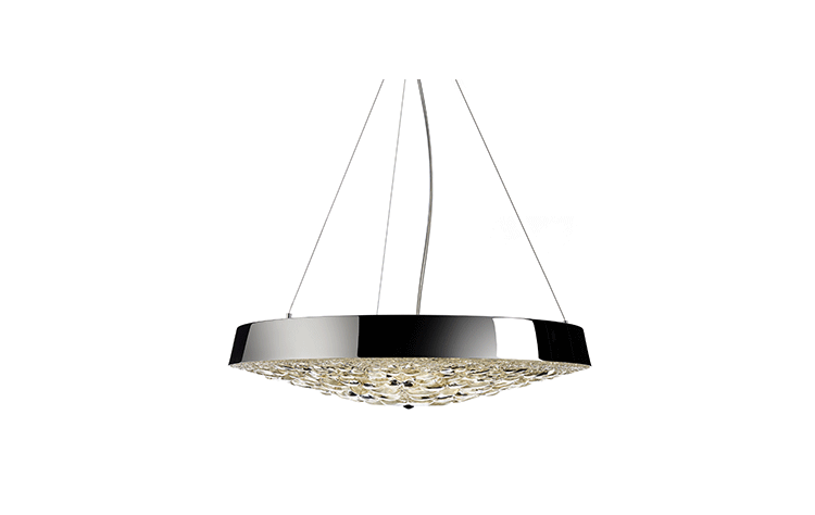"A magic mirror and the power of crystals transform a simple shell into an endless light bouquet of flowers', Marcel Wanders material crystal clear glass with chromed, gold plated shade, transparent cord and 3 steel cables additional Integrated LED lightsource"