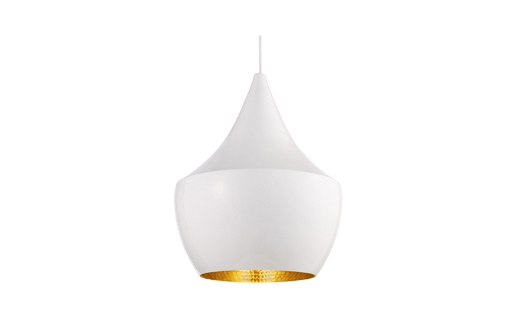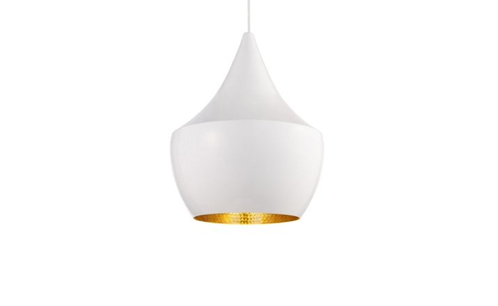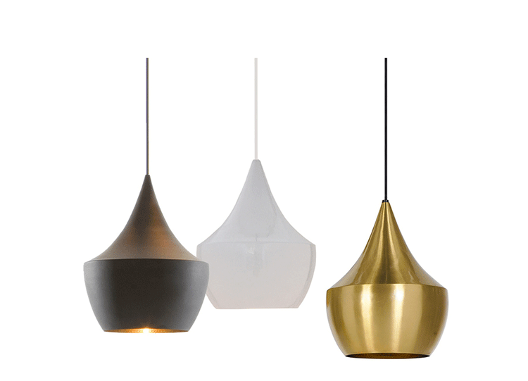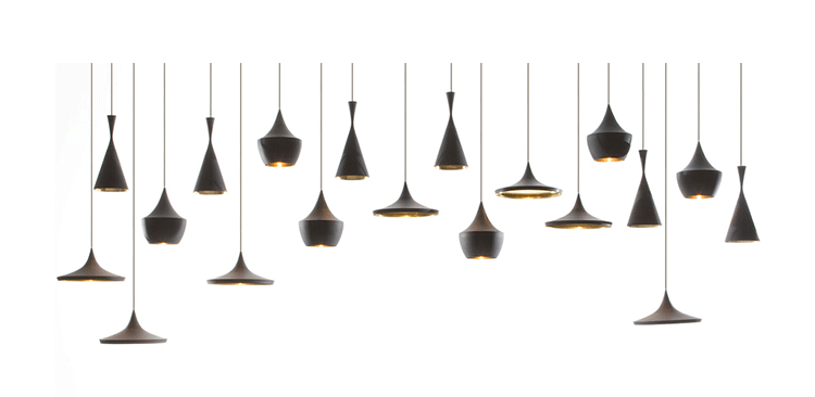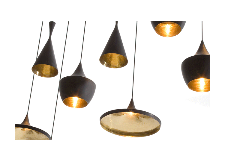 "Designer Tom Dixon was inspired by the shapes of Indian water carrying vessels when he designed his group of four different pendant lights. Hang just one, grab a pair, or hang the entire group of four in a composition of your own creation. The hand beaten brass ages naturally, creating a patina black external surface in contrast to the warm golden interior. available in 4 different shapes and sizes. "