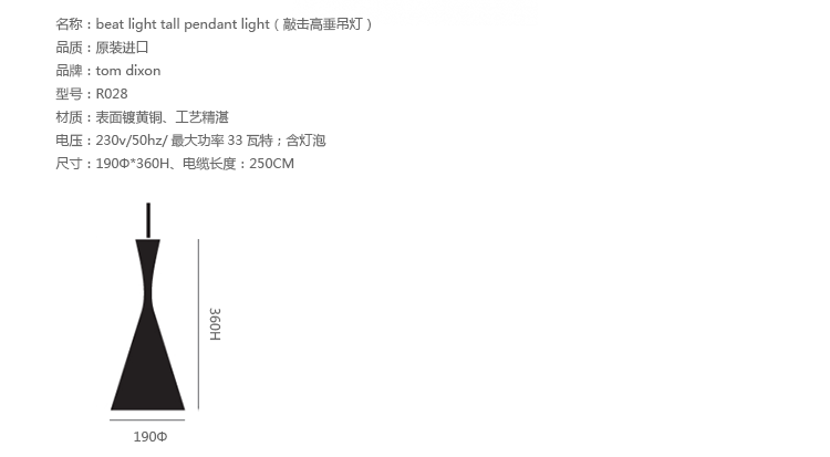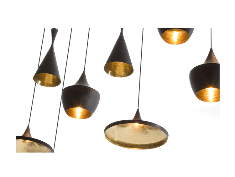 lamps series of brass beat light is a series of suspended luminaires by tom dixon. the lamps are handmade brass produced and receive their black aubenfarbe later. the beat lights differ in the form of their screens.beat light wide has a shallow but wide screen. beat light stout has a compact, rounded umbrella. beat light fat is small, but far and compact. and beat light tall is funnel-shaped and oblong.simple black housing all lamps is their simple black appearance together. the various screens but for different lighting. the brass one home is due to the different forms of different highly visible, why the lights in different but always as "related"remain identifiable.black exterior and interior messingfarbenes the black exterior and the brass one, bright home, giving the light an interesting and geheimnissvolles appearance. nevertheless, the beat light lamps are due to their simple forms and colors in each institution, the second look, but certainly a highlight that the views of themselves.the beat light lamp by tom dixon of brass in black in the variants produced wide, fat and tall. the lamps series is also in variations of brass in other colours.