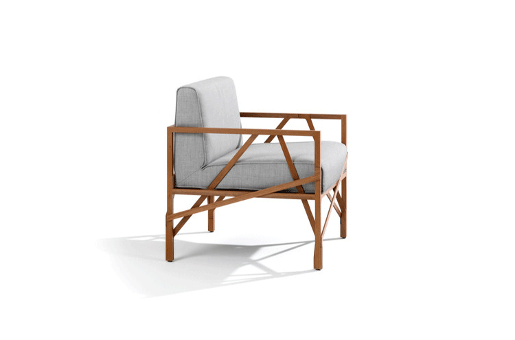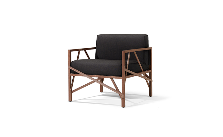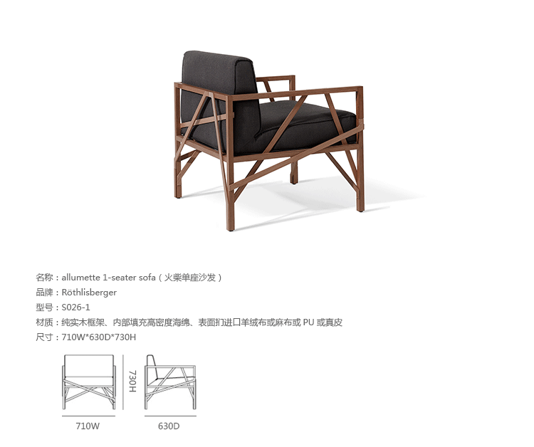 瑞士设计师Atelier Oï为Röthlisberger设计的一款沙发系列名为“Allumette(火柴)”,有单座、双座和三座。ALLUMETTE 沙发的醒目外观是归因于其来自阿鲁拉豆木树的硬木雕刻镂空框架设计。在这里,压力和反压力接受负荷的相互作用。优雅和独创性与稳定性相结合。其金属般基调的非漆木材经过打磨、抛光处理,允许其感性的存在,以充分发展。坐垫及靠垫内部填充高密度海绵、表面扪进口羊绒布或麻布或PU或真皮,提供高度的舒适感。