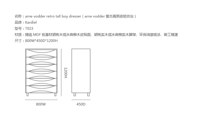 arne vodder retro tall boy dresser(arne vodder复古高男孩梳妆台)是Kardiel公司制作的经典实木家具,具有世纪中期的现代风格,6个滑动式抽屉通过精心制作,提供足够的空间存放衣物或其他物品。在现代主义的存储家具上, Finn Juhl和 Arne Vodder 最先尝试胶木和天然木的组合运用。这是大胆的创新,他们结合传统的新鲜的新兴技术与现代主义的概念。制作采用精选MDF板基材胡桃木或水曲柳木皮贴面、胡桃实木或水曲柳实木脚架、环保油漆喷涂、做工精湛。