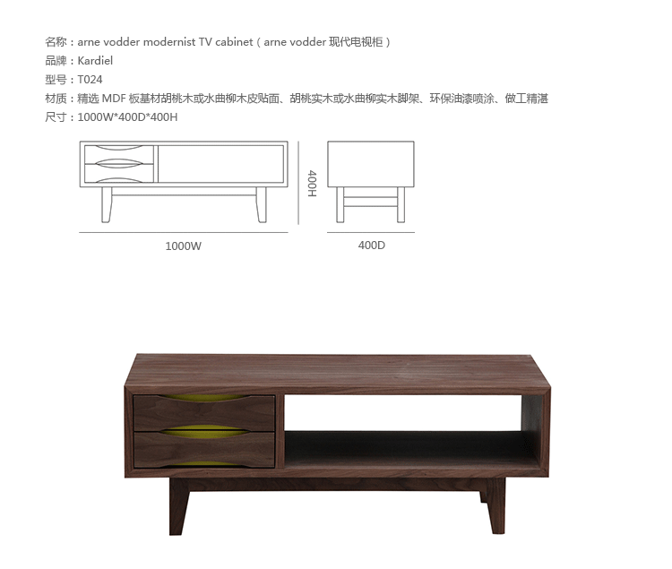 arne vodder modernist TV cabinet(arne vodder现代电视柜)是Kardiel公司制作的经典实木家具,具有世纪中期的现代风格。arne vodder modernist TV cabinet(arne vodder现代电视柜)由三部分组成:两个开抽屉、一个开放式抽柜。在现代主义的存储家具上, Finn Juhl和 Arne Vodder 最先尝试胶木和天然木的组合运用。这是大胆的创新,他们结合传统的新鲜的新兴技术与现代主义的概念。制作采用精选MDF板基材胡桃木或水曲柳木皮贴面、胡桃实木或水曲柳实木脚架、环保油漆喷涂、做工精湛。