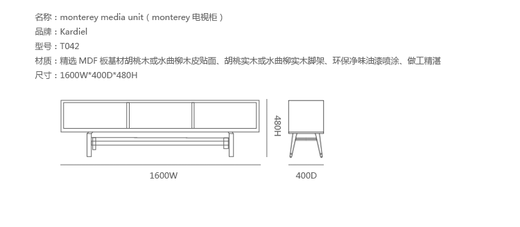 monterey media unit(monterey电视柜)是Kardiel公司制作的经典实木家具,具有世纪中期的现代风格。在现代主义的存储家具上, Finn Juhl和 Arne Vodder 最先尝试胶木和天然木的组合运用。这是大胆的创新,他们结合传统的新鲜的新兴技术与现代主义的概念。制作采用精选MDF板基材胡桃木或水曲柳木皮贴面、胡桃实木或水曲柳实木脚架、环保油漆喷涂、做工精湛,是您理想的选择。