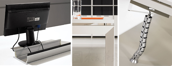 ※ 上图为大班台不同角度的展示,突出每个细节做工的精细,让我们对工艺的细腻产生美的视觉冲击,采用MFC,木析纹理清晰明快,与铝合金的搭配相得益彰。内藏钢架,保证结构与台面的强度。侧板与台面之间开有线孔,保证主台外观完整又兼顾了线路管理需求!