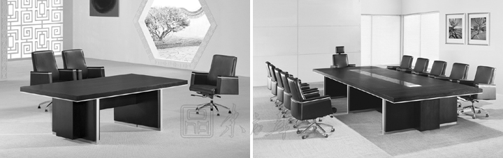 ※ 会议台采用黑橡木开放漆,边框带银色底漆,双色油漆搭配,方正造型,台面内藏钢架,追求造型简约时尚,也保证了台面的整体结构以及台面的抗弯强度。