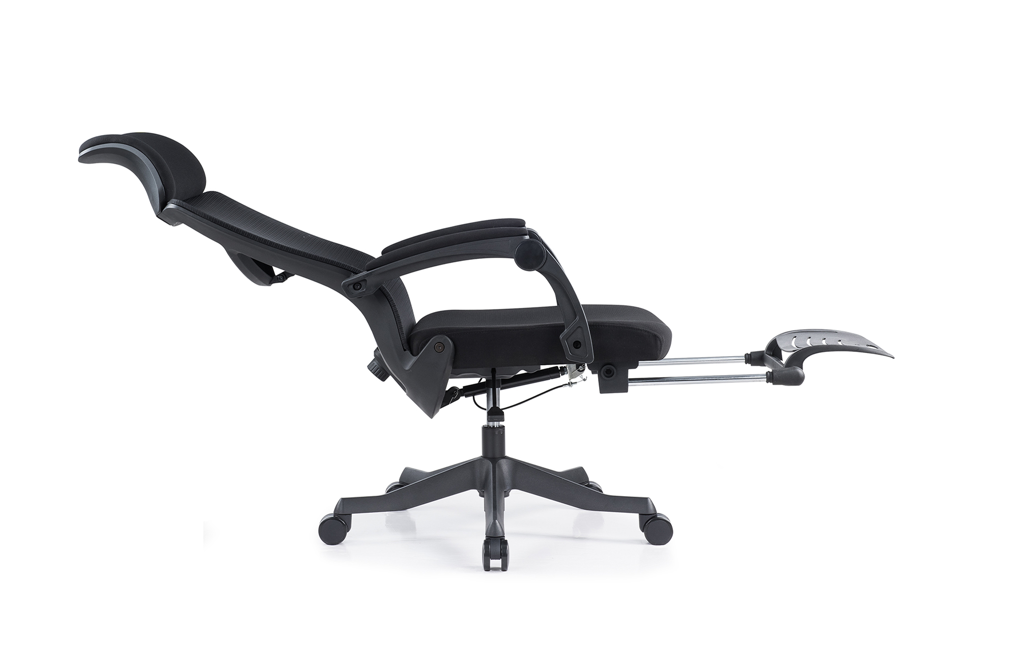 头枕:头枕靠背坐垫采用优质网布,升级大贴面软包头枕,柔软舒适 背框:黑色PA尼龙+玻璃纤维注塑配件,功能鱼骨腰枕,可前后调节灵动支撑,外拉式300N线控气动躺度功能,靠背可任意角度调节,最大可躺170° 坐垫:45#密度原生高弹力切割海绵坐垫,扪高弹力透气网布,安装隐藏式伸缩脚踏 扶手:自适应联动扶手,扶手面扪透气网布,手臂坐躺皆可支撑 气杆:优质黑色三级气压棒 椅脚:高强度345#尼龙脚,注塑一次成型五星脚 轮子:60黑色PU脚轮