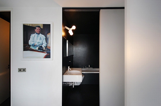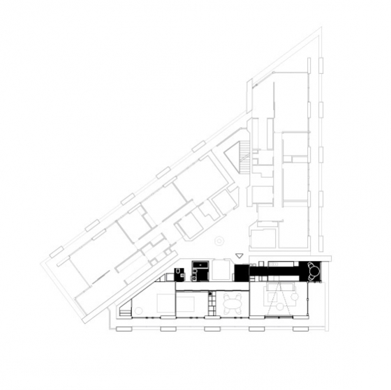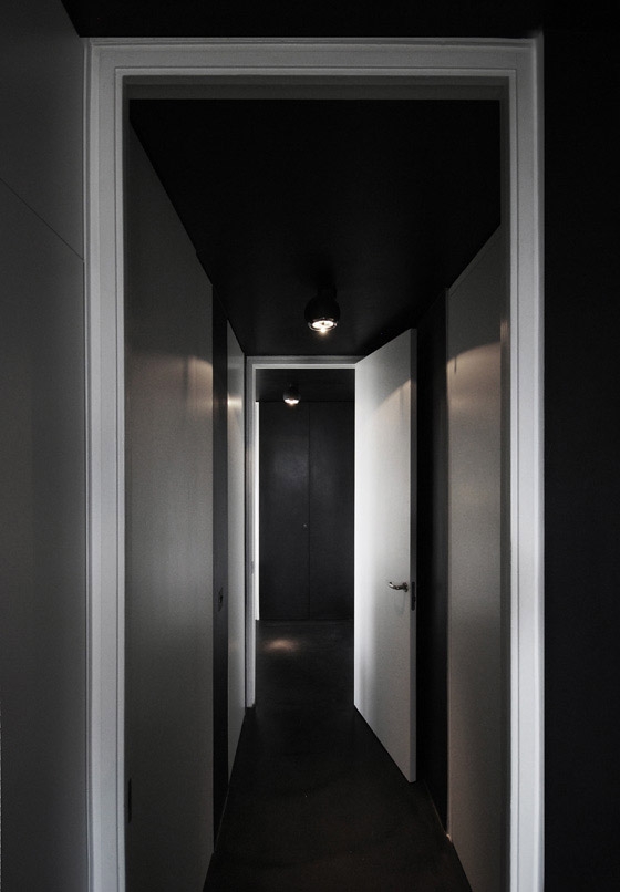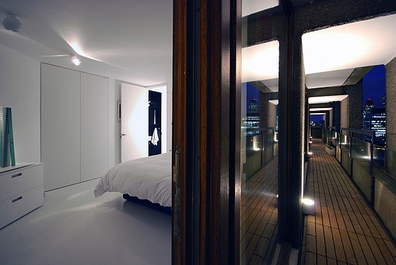 REFURBISHMENT OF A LISTED TOWER APARTMENT The flat is located above the city of London, only a short walk from the financial district amidst a on first sight, rough concrete oasis - the listed Barbican Centre. There is no traffic, instead ponds, gardens and a distinguished cultural centre on the ground level, including a concert hall, theatres, art galleries and cinemas. The 100 m² flat on the 17th floor of the Shakespeare Tower with spectacular view over the roofs of the city shall be the new residence of our client and also serve as an exhibition space. When the client purchased the flat it looked as if it was frozen in time with yellowed carpeting and the original kitchenette, albeit seemingly run down. Nevertheless the flat had a well arranged floor plan, although the corridor, kitchen and bathroom were located towards the inside of the building and therefore appeared dark and small. A Loggia stretches all around the flat. On the east side in front of the kitchen window it forms a terrace which offers unobstructed views over the skyline. From breakfast with the sunrise to an evening sunset it is only a few steps along the balcony. The flat shall become more flexible and spacious while maintaining the historic floor plan. Space for the display of contemporary art shall also be offered. The panoramic view must be visible from all corners of the flat. In order to achieve a greater lightness, the wall between the corridor and bedrooms was replaced by translucent sliding panels. Living rooms are completely coloured in white to underline their spaciousness and to form a minimalistic background for the art collection. In harsh contrast to this, the walls of the internal spaces of the corridor, bathroom and kitchen are coated with a smooth shimmering black cement finish. The dark finish allows small rooms to work larger and adds an elegance with the contrast to the white fixtures. The structure of the flat with its three layers becomes visible: the outside loggia, the white living rooms and the bathroom and kitchen completely wrapped in black. The solid wall between the bathroom and corridor was also removed and replaced by translucent sliding doors. When open, the owner can enjoy the panoramic view while soaking in the bathtub. If the balcony doors are also open, the gentle rumble of the metropolis can also be heard. The Barbican Estate was built between 1965 and 1976, on a site that was bombed in World War II.The complex was designed by the architects Chamberlin, Powell and Bon. The estate was officially opened in 1969 and is now home to around 4,000 people living in 2,014 flats. The flats reflect the widespread use in Britain in the 1960s and 1970s of concrete as the visible face of the building. "The intention underlying our design is to create a coherent residential precinct in which people can live both conveniently and with pleasure. Despite its high density the layout is spacious: the buildings and the space between them are composed in such a way as to create a clear sense of order without monotony. Uninterrupted by road traffic (which is kept separate from pedestrian circulation through and about the neighbourhood) a quiet precinct will be created in which people will be able to move about freely enjoying constantly changing perspectives or terraces, lawns, trees and flowers seen against the background or the new buildings or reflected in the ornamental lake." Chamberlin, Powell & Bon, Architects "Barbican Redevelopment" April 1959