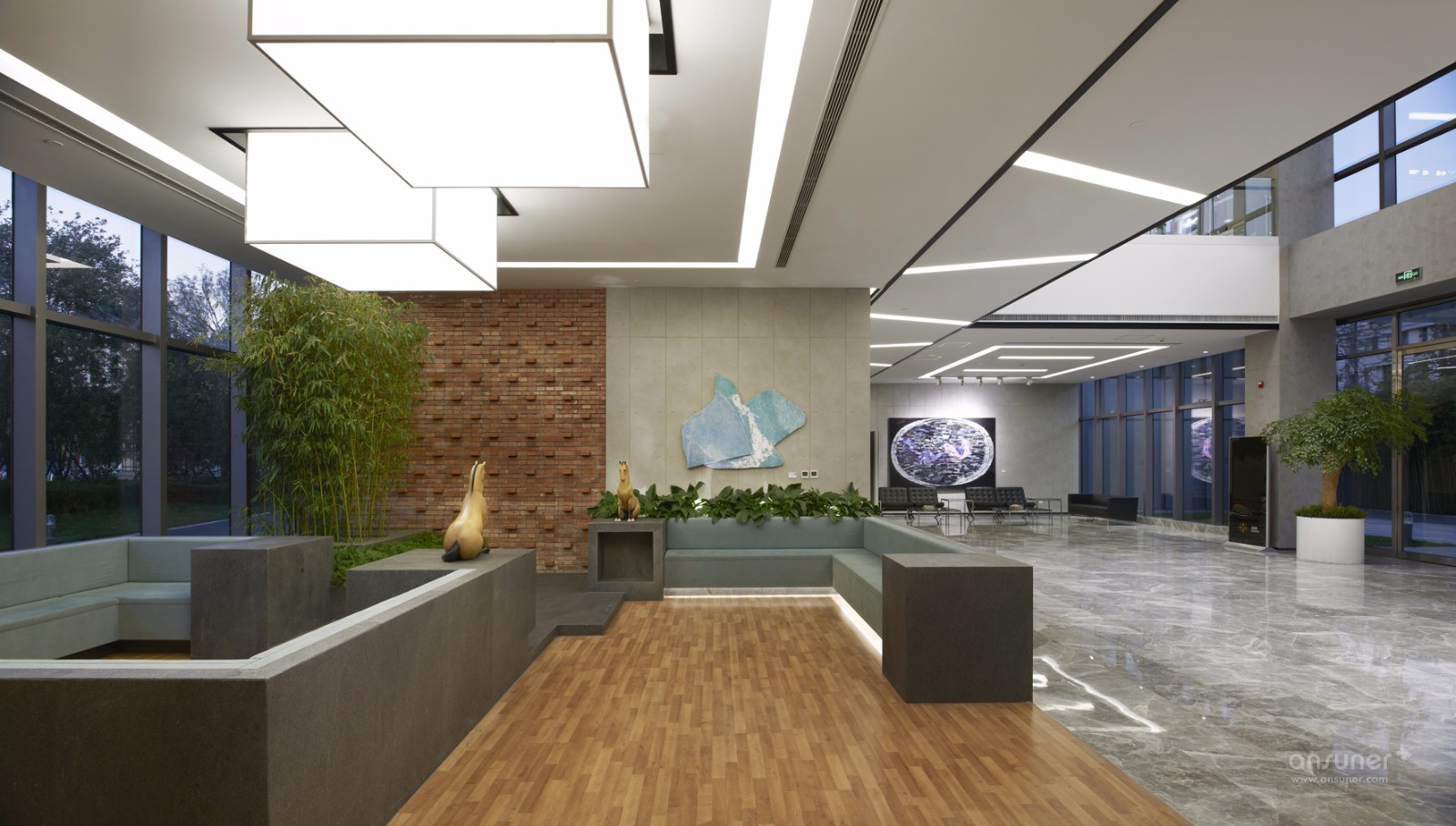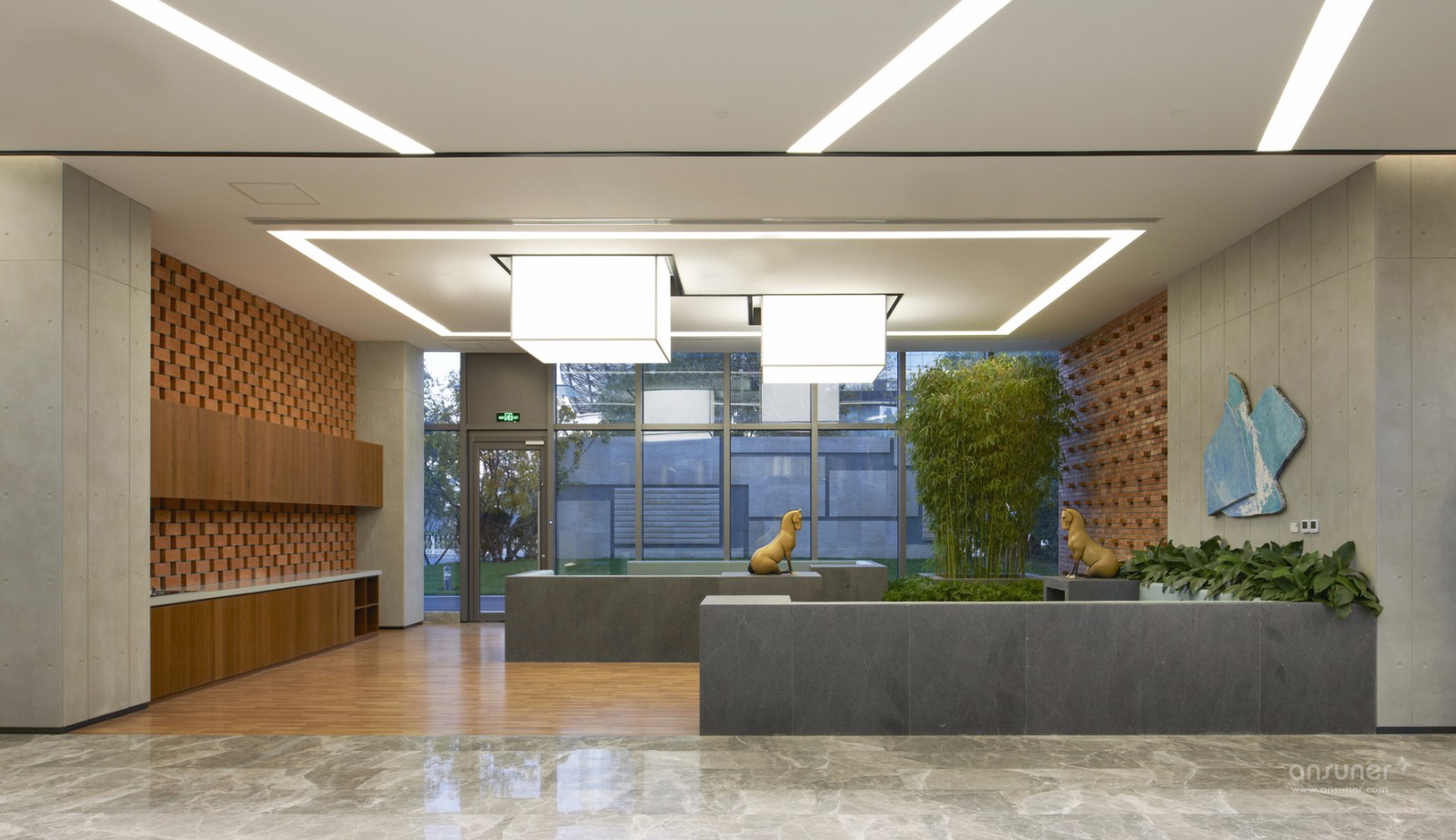 大堂是一个两层通高的纯粹的空间,灰色与白色奠定了空间稳重大方的基调。入口正对一个水吧休闲区,在这个区域砖、混凝土与木材几种材质纹理有机地拼接在了一起,配合点缀的绿植和摆件,构成了一处优雅别致的休闲空间。