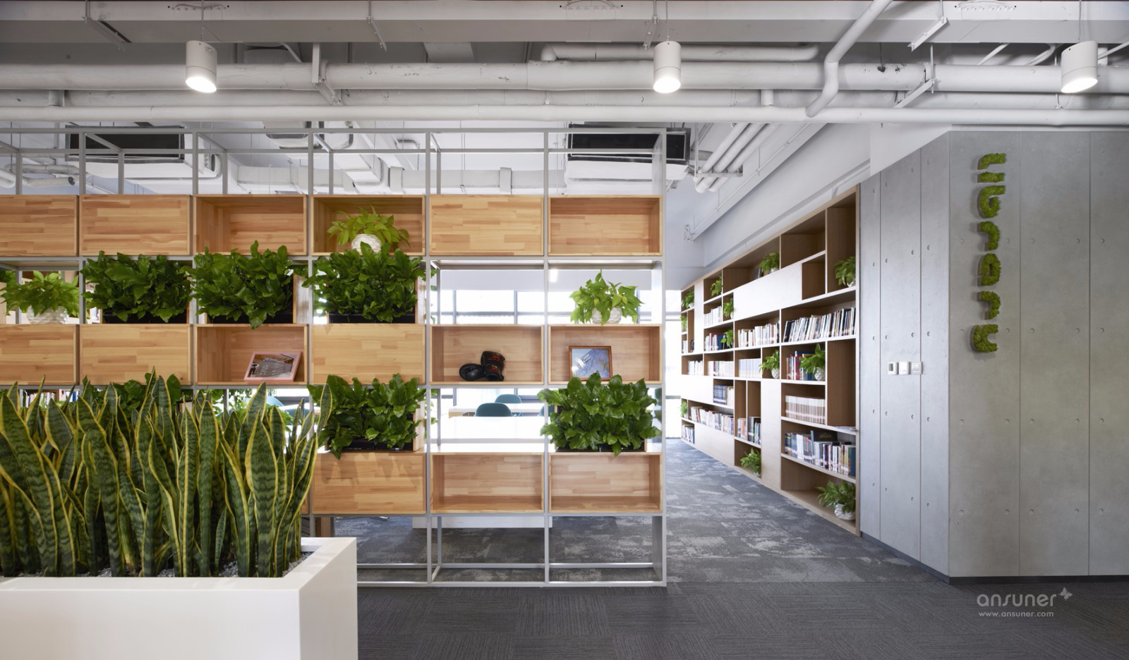 四层和五层的中部分别设置了书吧休闲区和生态氧吧休闲区,这里是办公楼里最令人感到舒适愉悦的空间之一。大面积的原木色和绿植,色彩明快的墙贴和家具,将快节奏的工作氛围阻隔在外,围出一个放缓节奏的小小岛屿。午后时分,充足的自然光洒满整个空间,人们可以随意地从书架上取几本书,倒上杯咖啡,靠在舒适的沙发里,享受一段安静的放松时光。