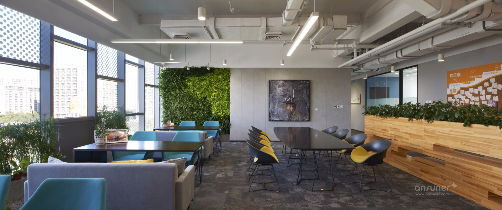空间以灰白和木色为主色调,局部空间用鲜艳亮色加以点缀和活跃气氛。整体设计风格现代,稳重中又不失活力与激情,且处处体现着公司对员工的人文关怀。