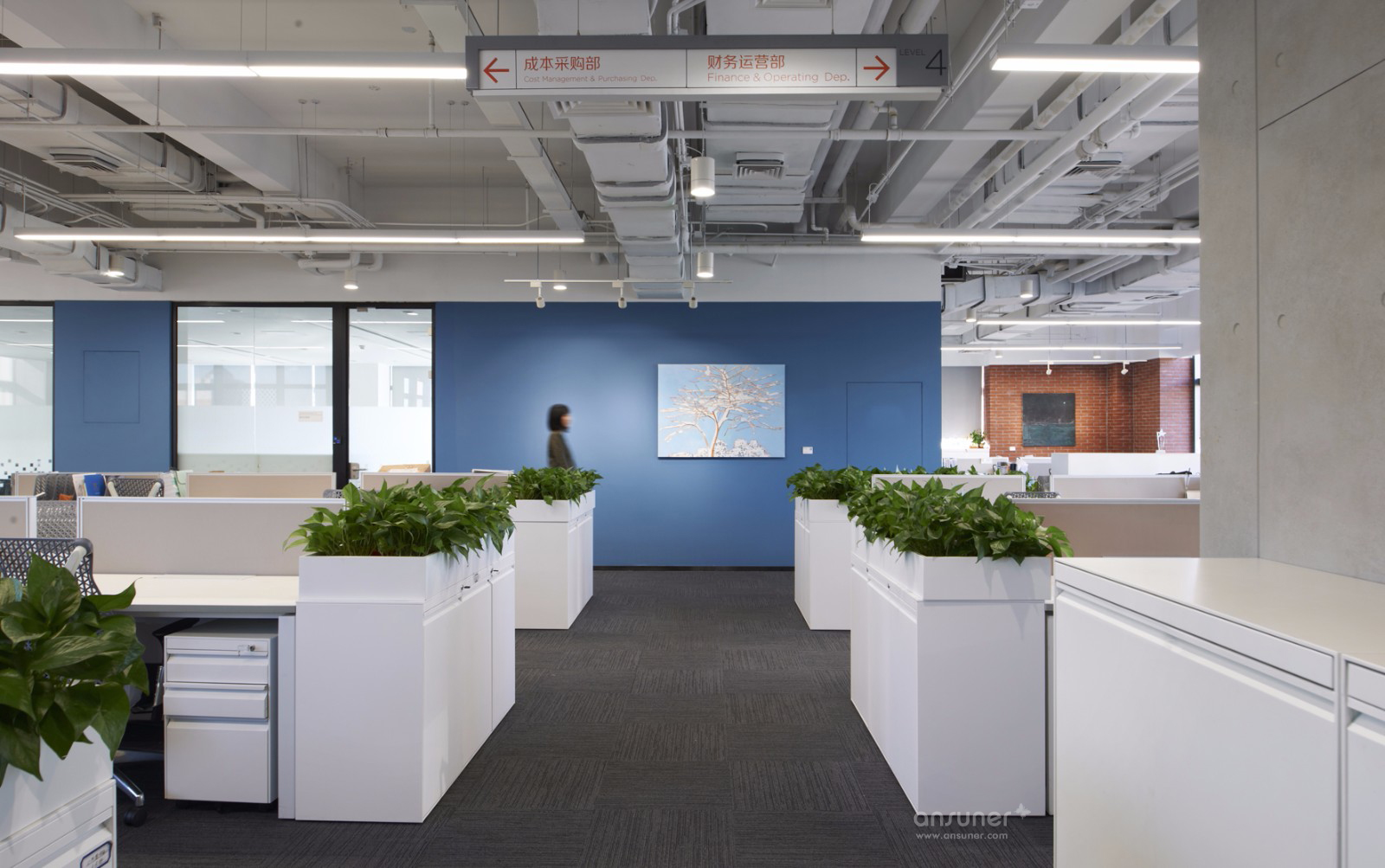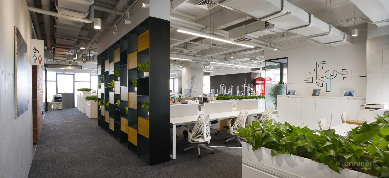 开放办公区以干净的白色调为主,局部以红砖墙为点缀,再配以鲜红色复古造型的电话亭,整个空间简洁明快,充满现代气息又有十足的趣味。