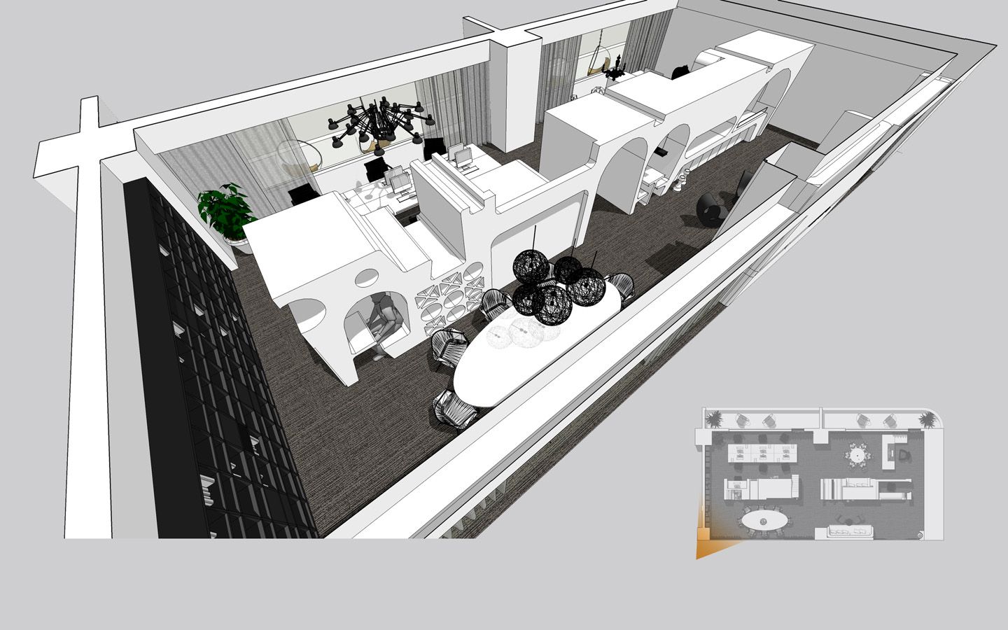 本案设计初期,乐尚的设计师们将公司自身“创意自由,规划严谨”的设计理念,将我们工作与客户交流的平台环境,最终分为两个追求的目标,其一展现并满足自身所需的平面功能外,将这一平面立体展开,实现了其二我们想要表达的空间感、层次感、质感,最终我们需要的乐尚在三维立体空间展现在我们面前。 初期的概念构想,一个时代的元素融入另一时代中,体现为取一种工业性质的混凝水泥墙体,恰到好处的融合到很现代的空间中。这两种质感不同的元素混合,精心的在设计师的深化思维中,重新进行了空间搭配,二者发生了很巧妙的发酵,同时,大面积采用玻璃隔断,让每个比邻区域通透感增强,与此同时,乐尚的抹茶绿及橙色标准色调,恰到好处穿插在每个区域中。而这些恰恰体现在不同场合下的整体视觉感,干净整洁的线条贯穿空间始终同时力求突出舒适性。各区域即独立又相互融合,亦可根据公司的使用和发展灵活调配。布局上层次分明,以一致的线条走向自然过渡到每个办公空间,以简洁的线条表现形式美,再配以恰到好处的灯光,营造出一个简洁明朗、自然通透的现代空间。用朴素的手法表现空间的本质,传达文化的内涵。营造出一个充满张力,移步逸景的办公空间。