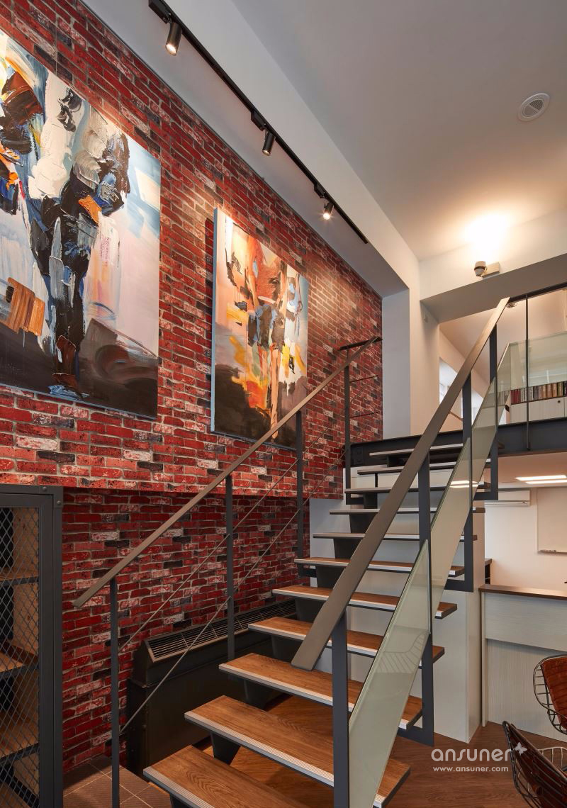 善用挑高空间打造大面积落地窗,并以大量镂空铁件彰显利落气息,设计师更巧妙使用仿红砖壁纸、仿清水模漆以及木纹塑胶地砖,大幅降低装修预算,完成工业风格营造。以一道吧台巧妙分隔接待区与后方会议空间,兼具隐私与置物功用,更利用结构墙下方畸零空间规划柜体,拓增收纳机能。二楼以办公空间为主,以开放设计与纯白色调一扫传统 OA 办公的制式呆版,将有着通风孔设计的无印风置物柜贴齐壁面,让行进动线更加流畅,小型会议室的玻璃隔间更抹除狭小阴暗的可能性。