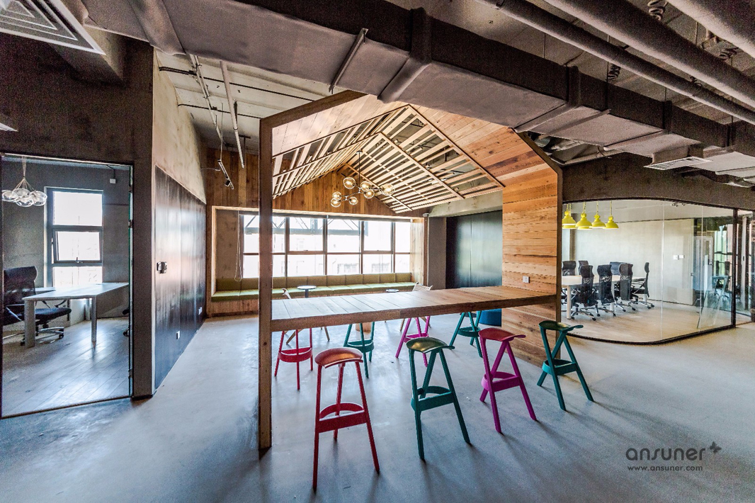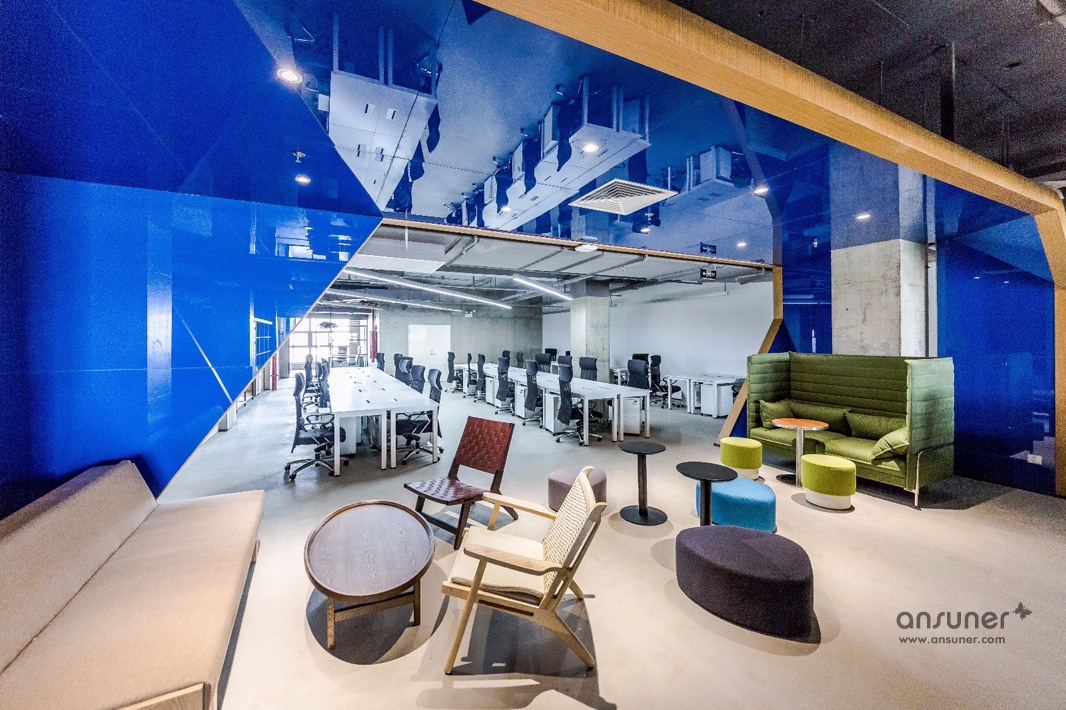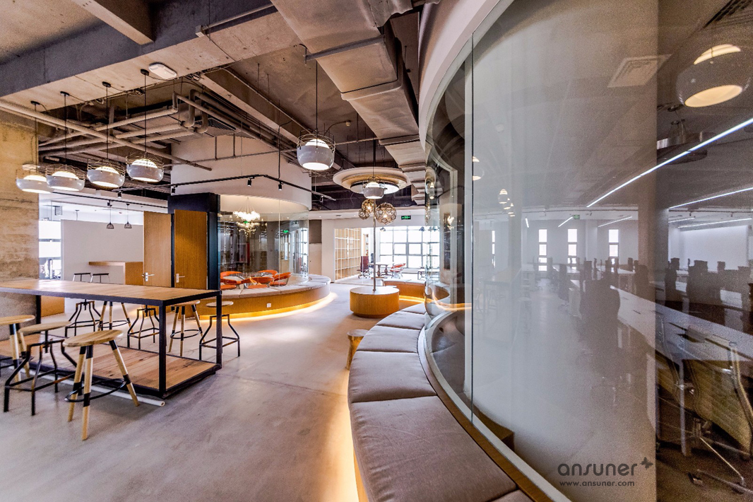 圆弧形的会议室和休闲区是本次设计的核心,也是凸显共享和交融的重点,通透的玻璃会议室和无遮拦的休闲区设计形成完美的结合。休闲区的设计得益于当今的科技发展,移动式办公成为可能。标注办公桌渐渐转化为共享办公桌,多元化的移动办公方式提供了更丰富的选择。个人固定办公桌时代已经成为过去,员工要考虑的事情就是选择哪里更合适今天的心情、今天的工作。