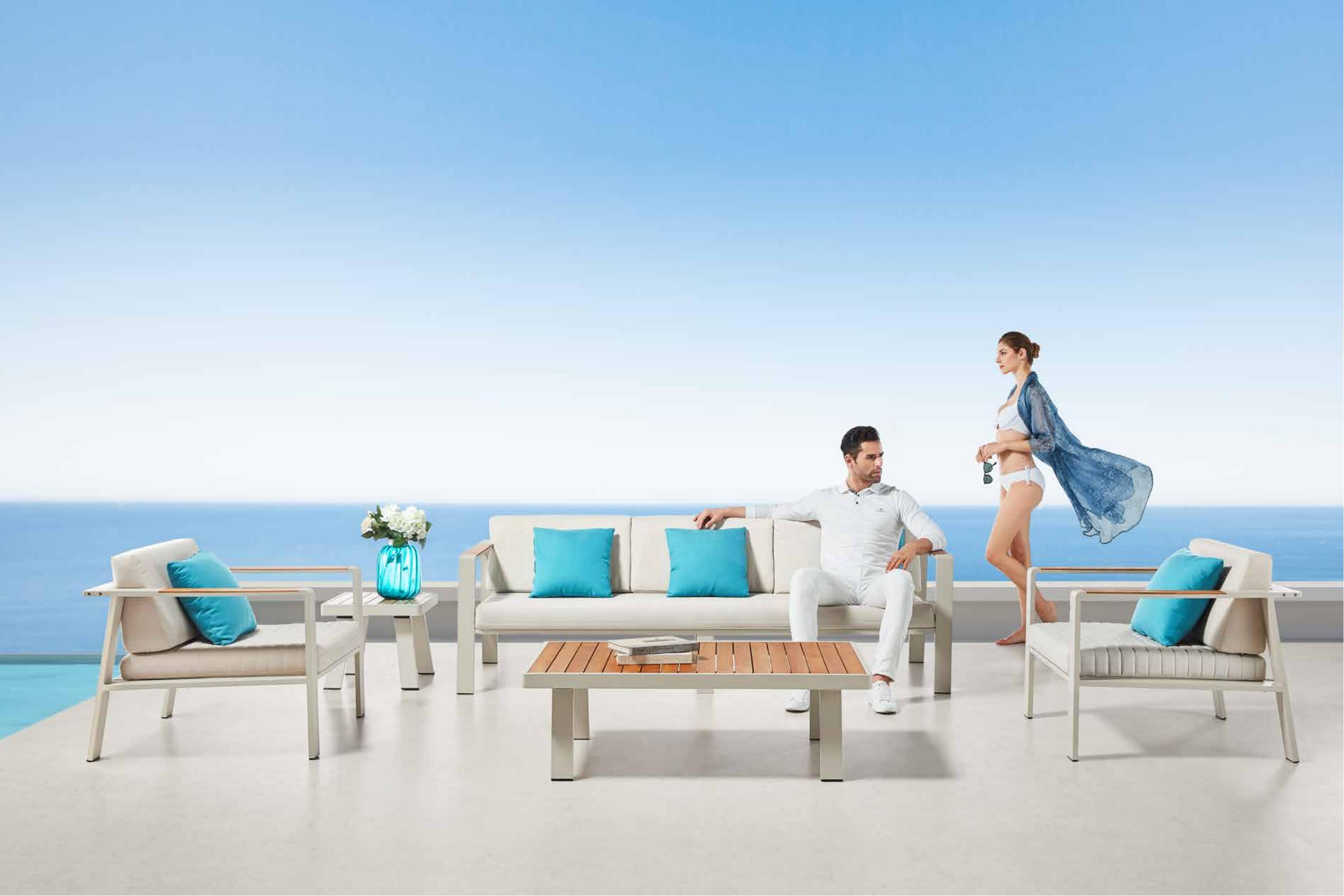诺菲户外休闲系列由大件套沙发、组合沙发套、餐台系列、吧台系列、遮阳床、秋千等组成。它拥有一个完整的系列来满足各种生活需求。在扶手和桌子台面安装了天然柚木,用柔软轻盈的靠垫设计,诺菲展示了简约风,但从未失去它的舒适。有了 DIY的概念,消费者可以很容易地按说明书进行组装。 【诺菲系列】 “多元”---系列产品配套齐全,沙发、餐桌椅、躺床、高吧餐桌椅、秋千等,满足您的各种生活需求 “DIY”---诺菲全品类产品包装均为拆装,能够最大限度减少装柜空间,同时消费者可参照安装说明书轻松组装产品 “融合”---A级缅甸进口柚木+航空级合金框架+环保布料软包,三者完美融合,简约却不失高级质感